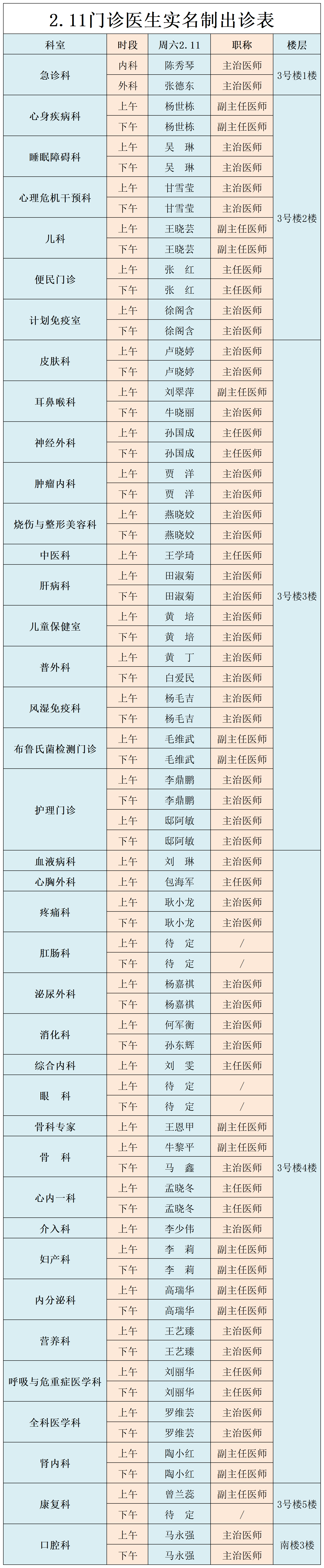 甘肃省第二人民医院、西北民族大学附属医院2月11日(星期六) 门诊出诊信息