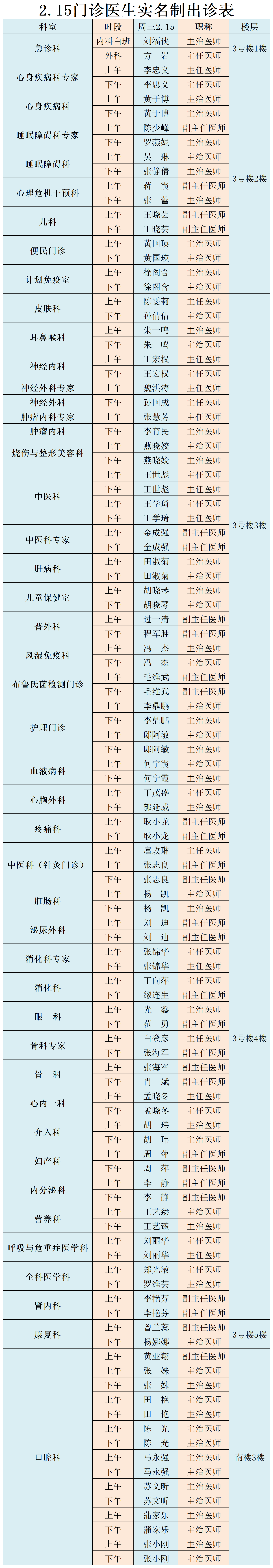 甘肃省第二人民医院、西北民族大学附属医院2月15日(星期三) 门诊出诊信息