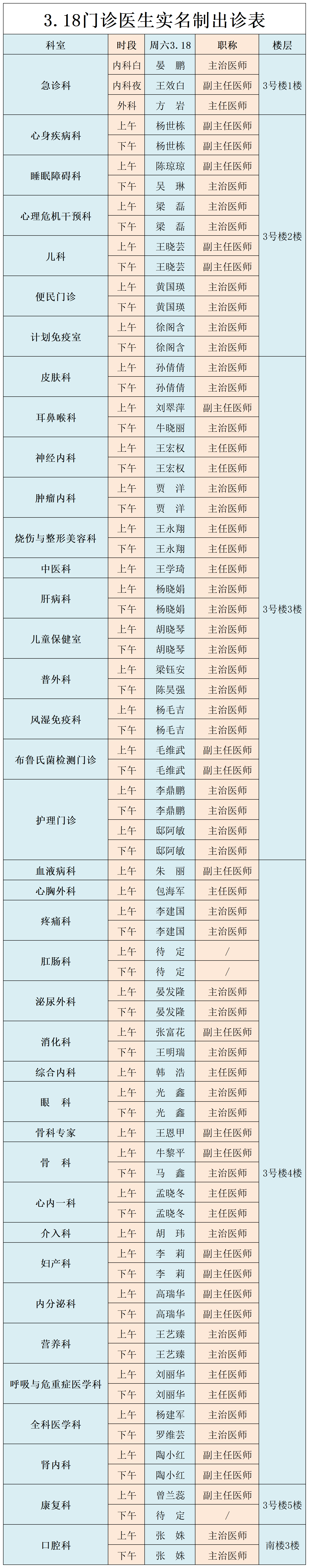 甘肃省第二人民医院、西北民族大学附属医院3月18日(星期六) 门诊出诊信息