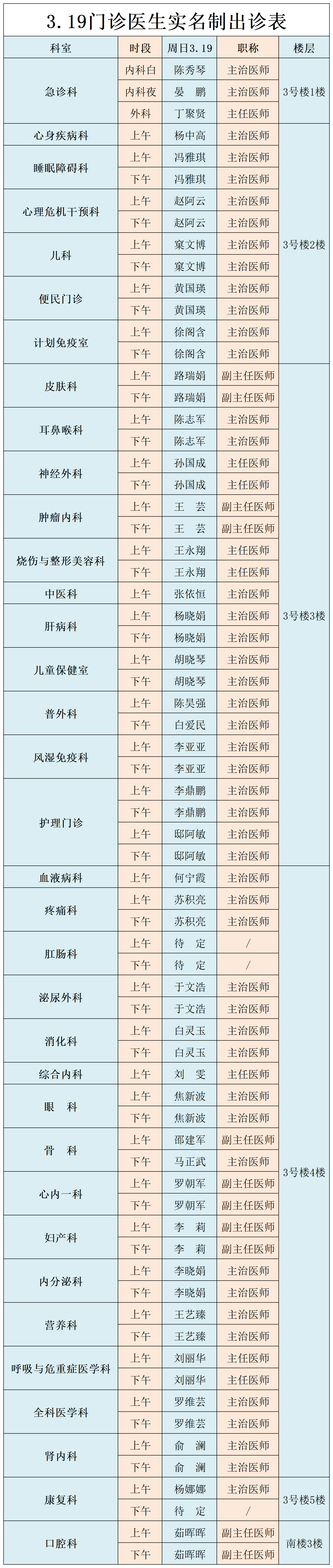 甘肃省第二人民医院、西北民族大学附属医院3月19日(星期日) 门诊出诊信息
