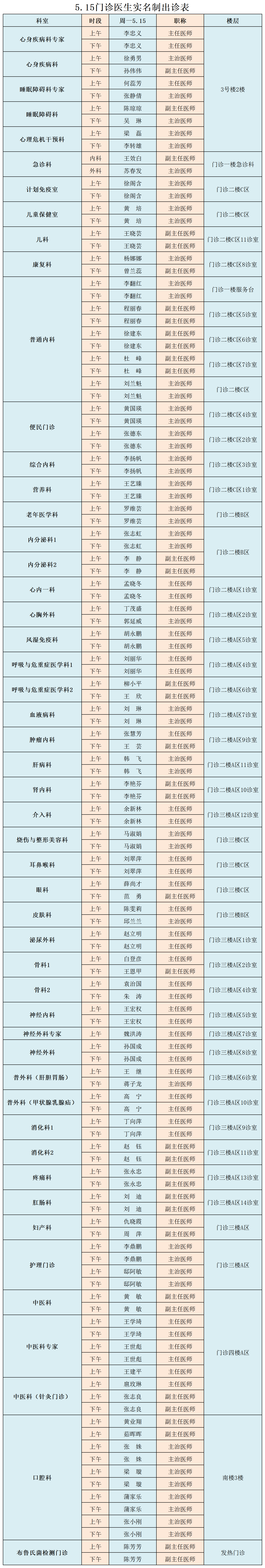 甘肃省第二人民医院、西北民族大学附属医院5月15日(星期一) 门诊出诊信息