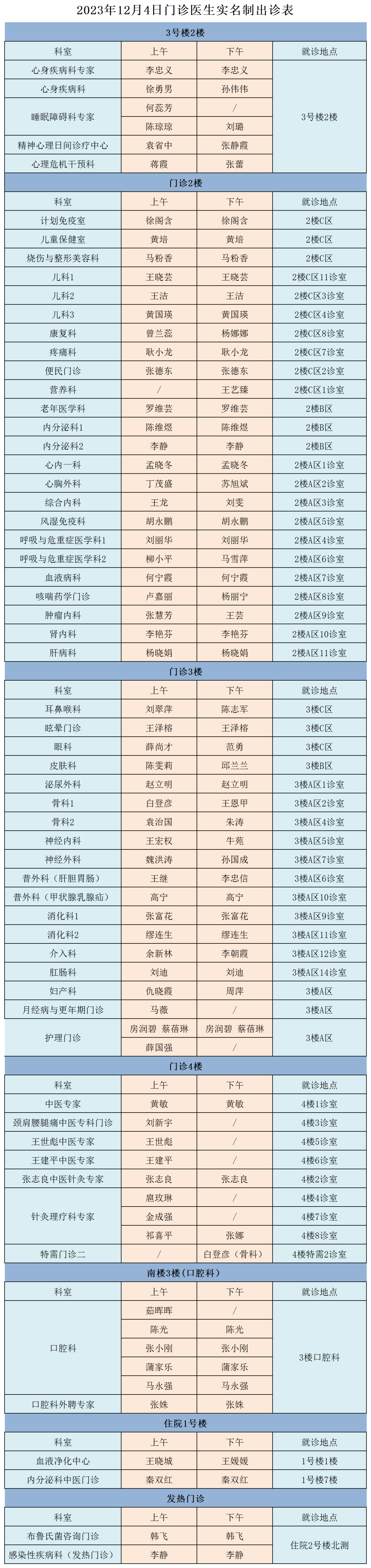 甘肃省第二人民医院、西北民族大学附属医院12月4日(星期一) 门诊出诊信息