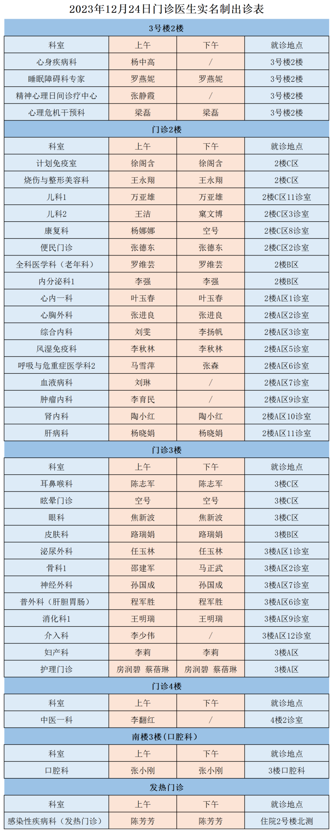 甘肃省第二人民医院、西北民族大学附属医院12月24日(星期日)门诊出诊信息