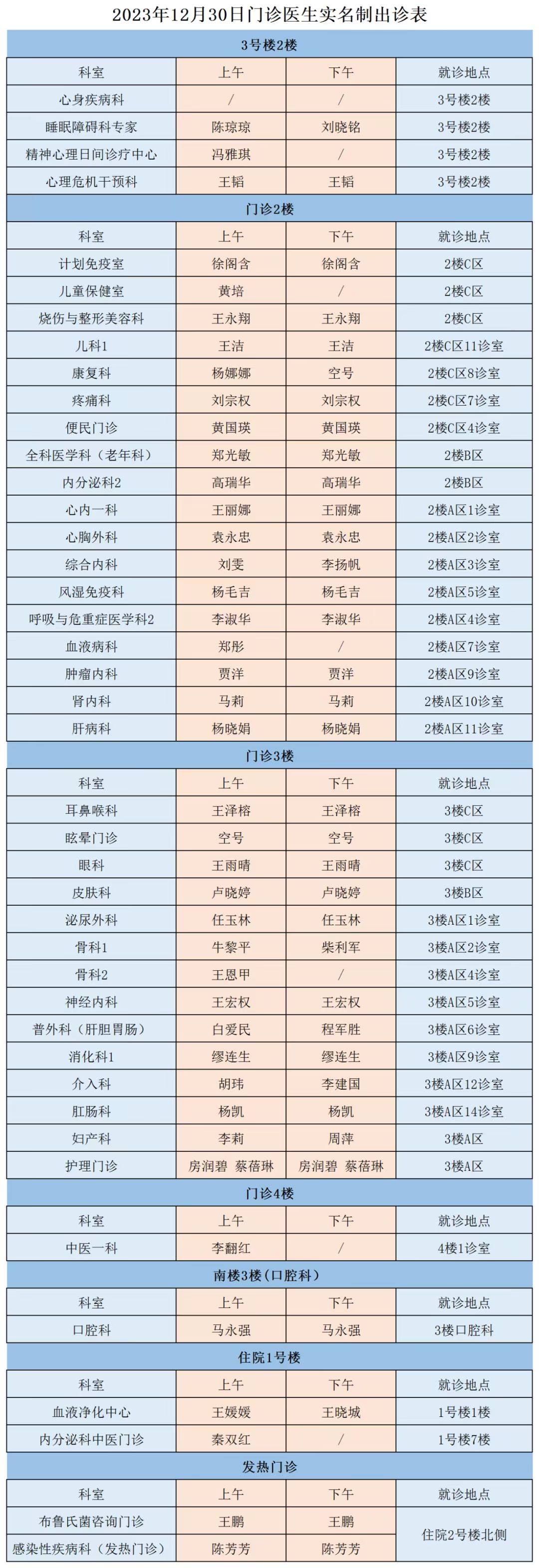 甘肃省第二人民医院、西北民族大学附属医院12月30日(星期六)门诊出诊信息