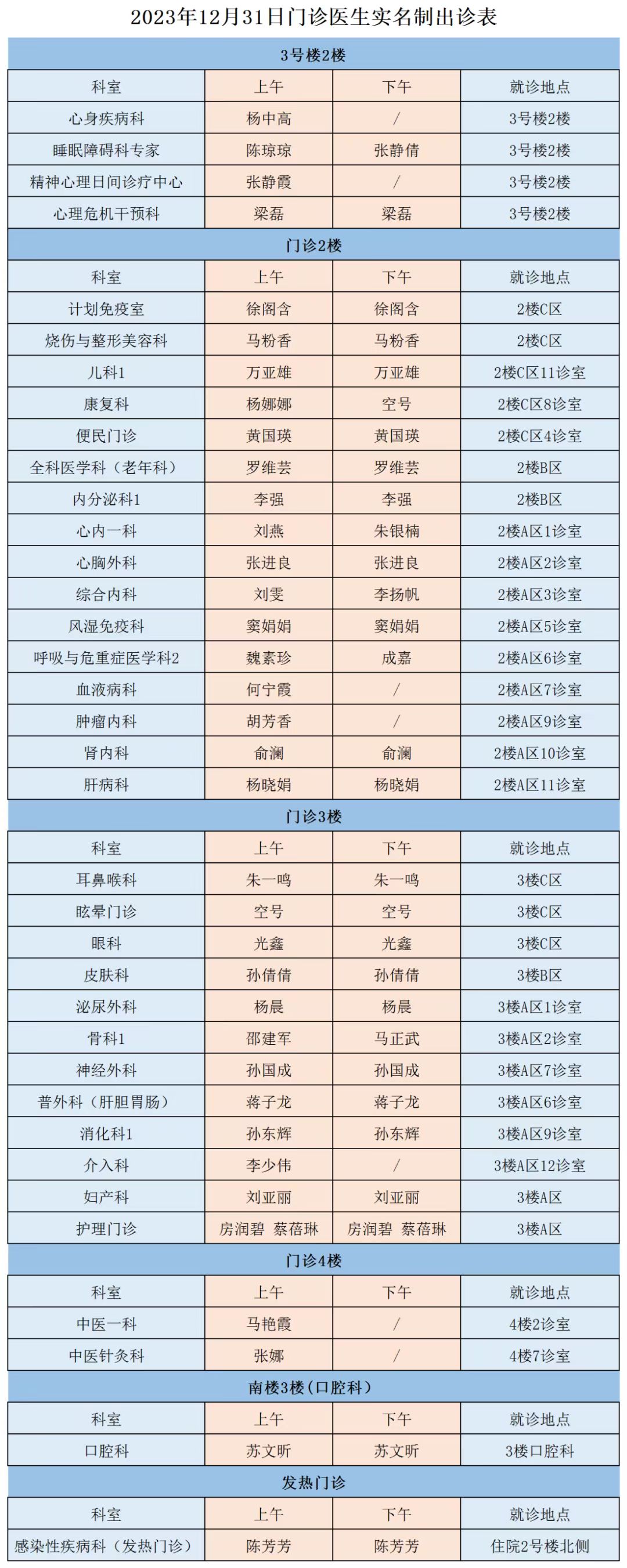 甘肃省第二人民医院、西北民族大学附属医院12月31日(星期日)门诊出诊信息