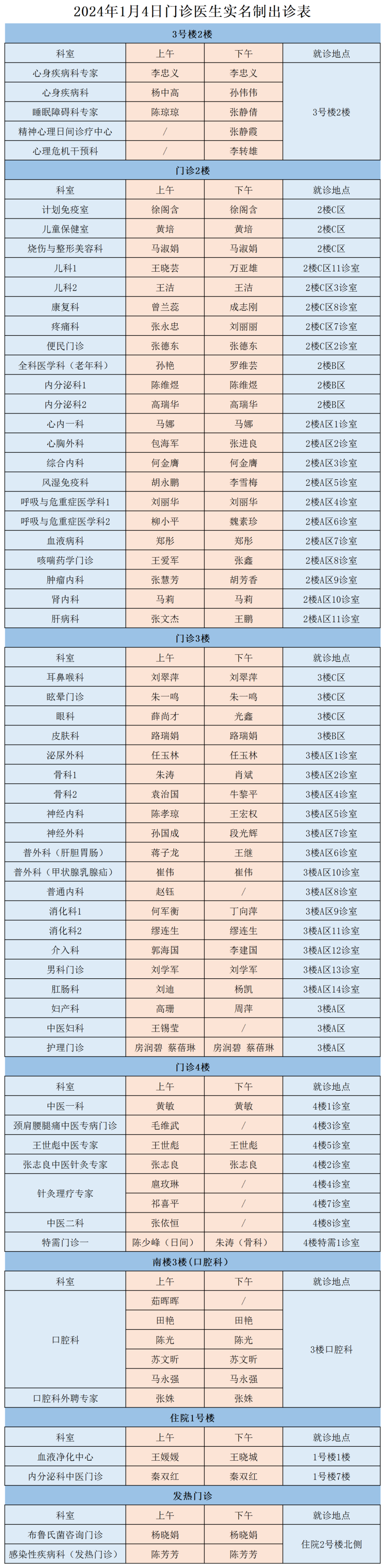 甘肃省第二人民医院、西北民族大学附属医院1月4日(星期四)门诊出诊信息