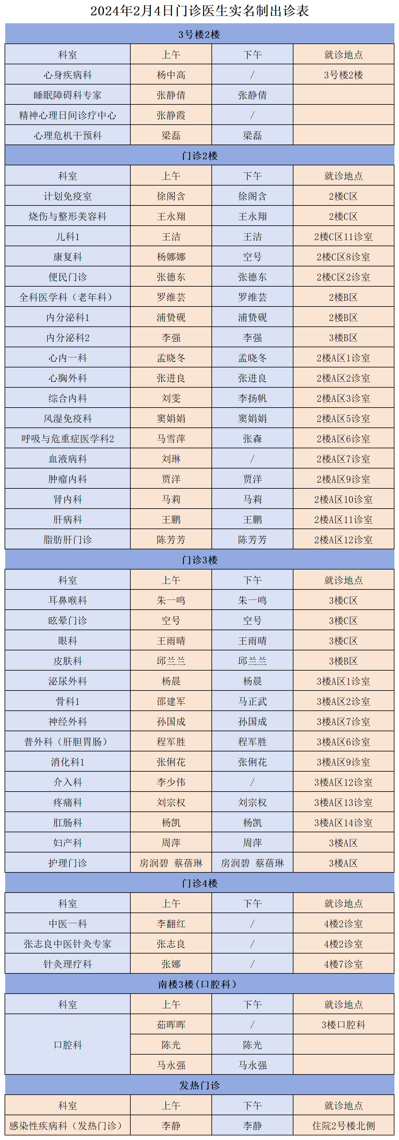 甘肃省第二人民医院、西北民族大学附属医院2月4日(星期日)门诊出诊信息