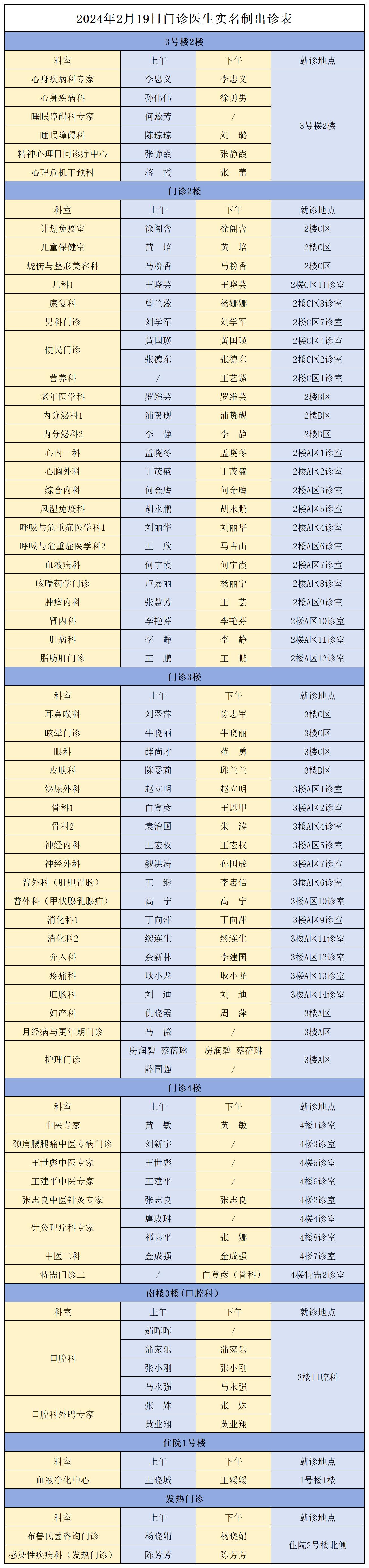 甘肃省第二人民医院、西北民族大学附属医院2月19日(星期一)门诊出诊信息