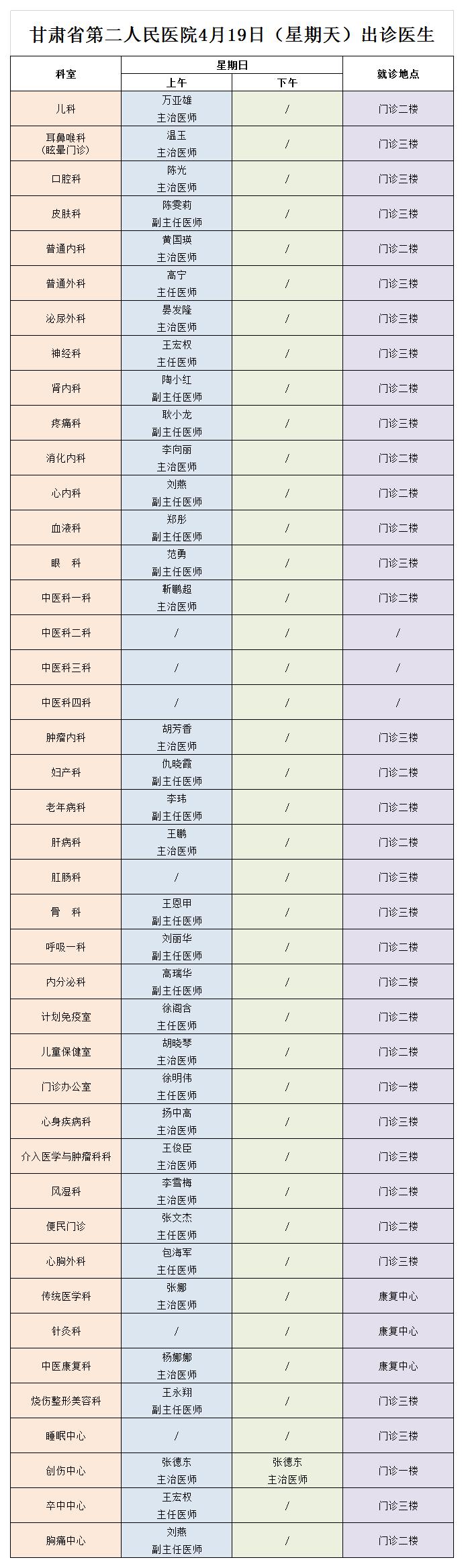 西北民族大学附属医院、甘肃省第二人民医院4月19日(星期天) 门诊出诊信息