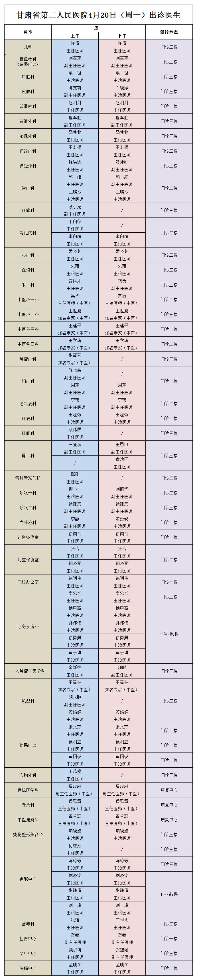 西北民族大学附属医院、甘肃省第二人民医院4月20日(星期一) 门诊出诊信息