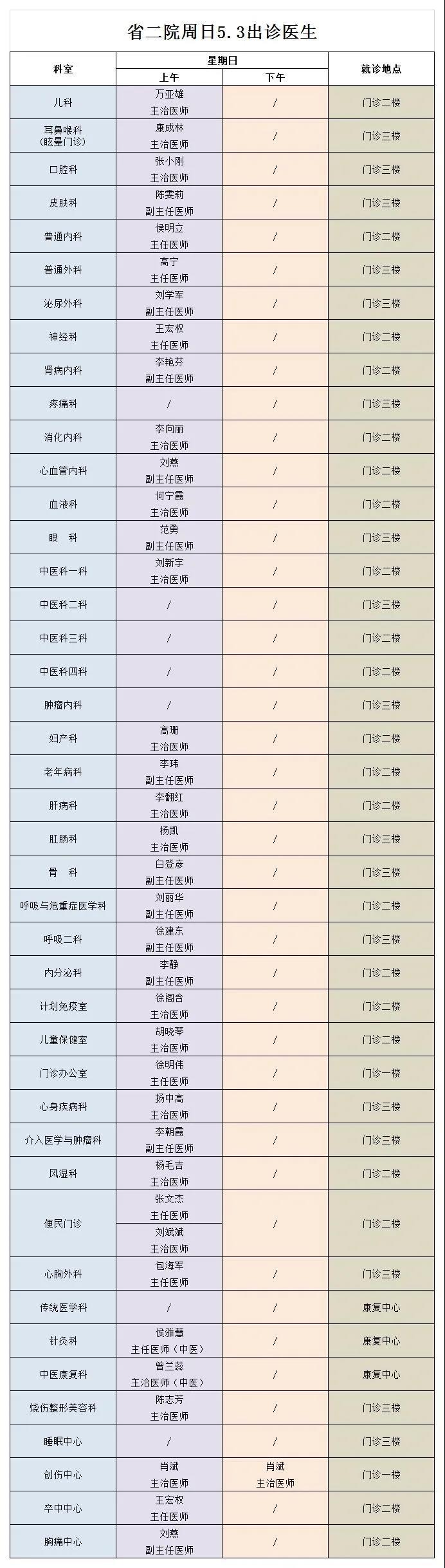 西北民族大学附属医院、甘肃省第二人民医院5月3日(星期天) 门诊出诊信息