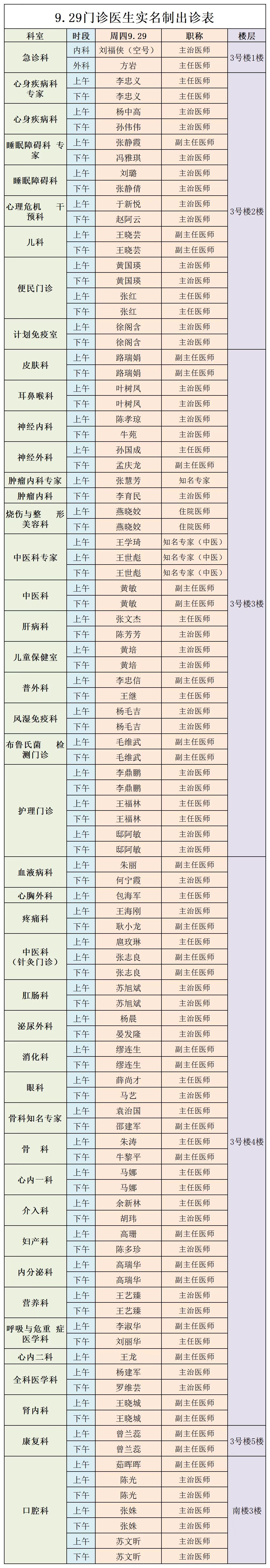 甘肃省第二人民医院、西北民族大学附属医院9月29日(星期四)门诊出诊信息
