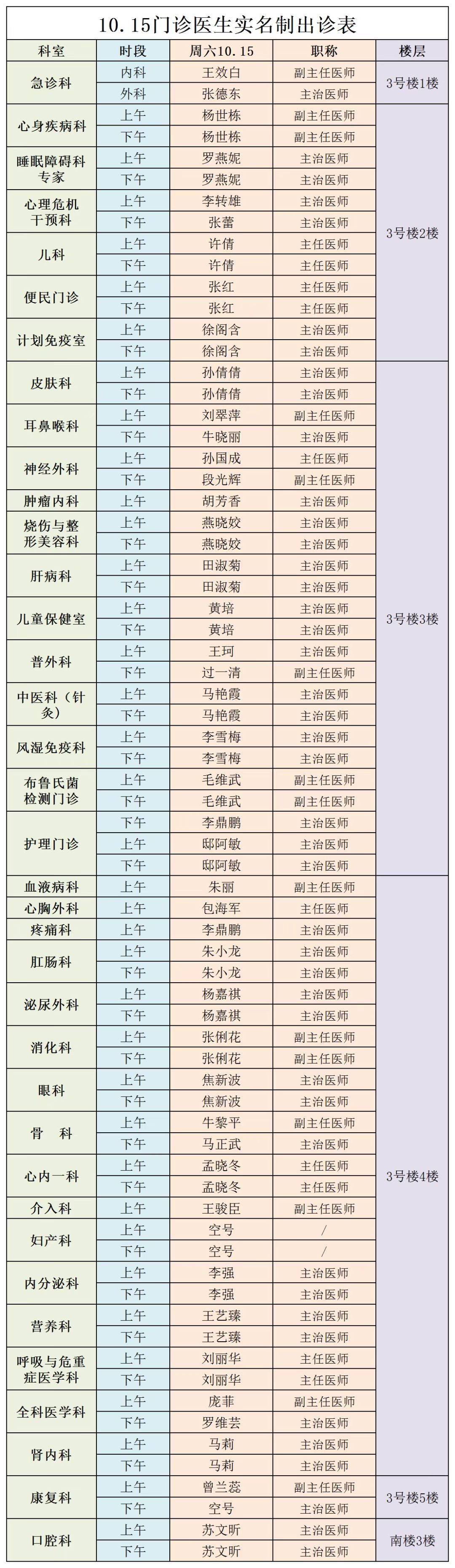 甘肃省第二人民医院、西北民族大学附属医院10月15日(星期六) 门诊出诊信息