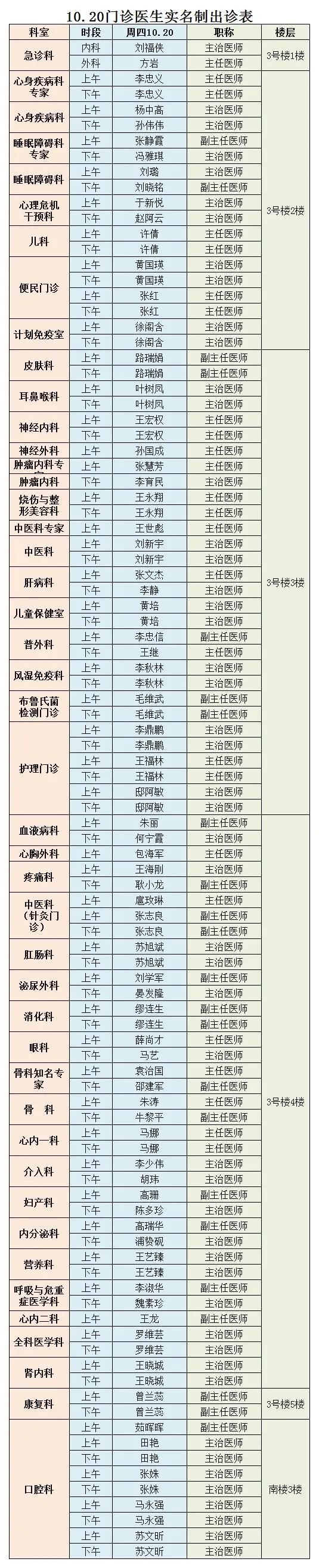 甘肃省第二人民医院、西北民族大学附属医院10月20日(星期四) 门诊出诊信息