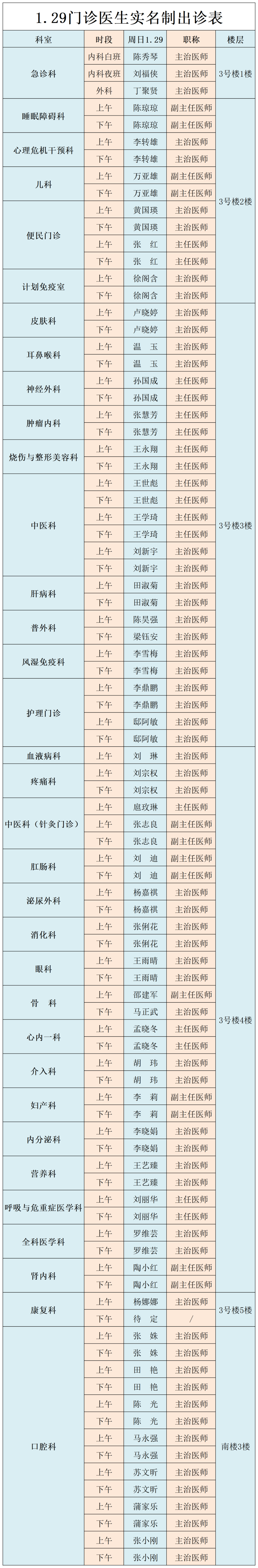 甘肃省第二人民医院、西北民族大学附属医院1月29日(星期天) 门诊出诊信息