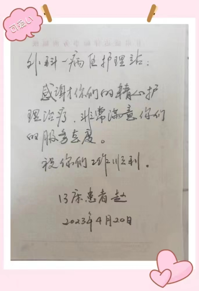 纸短情长,温暖人心。准备出院的王爷爷颤颤巍巍来到护理站,表达了住院期间骨科护理人员对自己无微不至的照顾之情,王爷爷觉得口头表达不够,返回病房让家属找来纸笔,写了短短的感谢信。信中写道,“非常你们的精心护理治疗,非常满意你们的服务态度,祝你们工作顺利!”