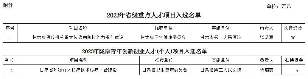 近日,中共甘肃省委组织部公布了2023年度省级重点人才项目和陇原青年创新创业人才项目(团队)项目入选名单,我院副院长张浩军申报的《甘肃省医疗机构重大传染病防控能力提升建设》项目入选2023年省级重点人才项目,该项目获资助资金30万元;呼吸与危重症医学科副主任医师杨燕霞申报的《甘肃省呼吸介入诊疗技术诊疗平台建设》项目入选2023年陇原青年创新创业人才(个人)项目,该项目获资助资金6万元。