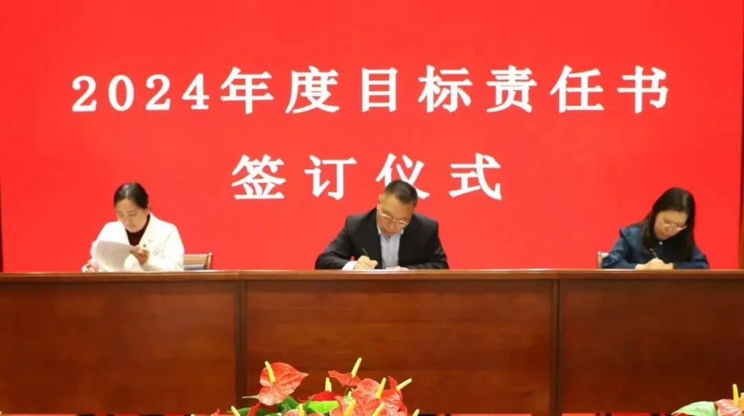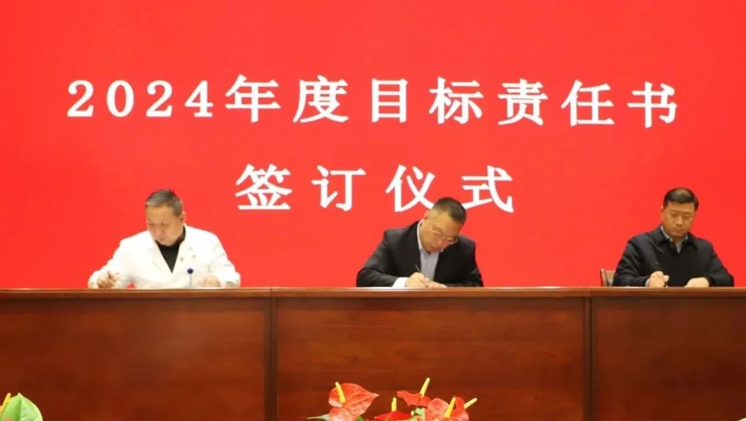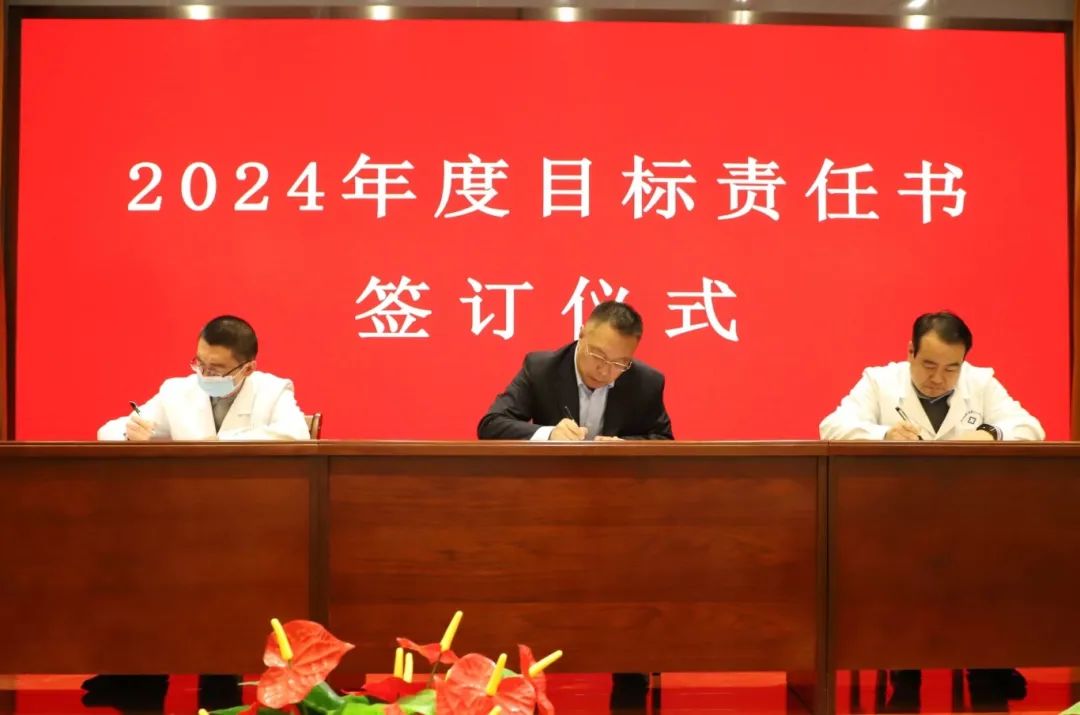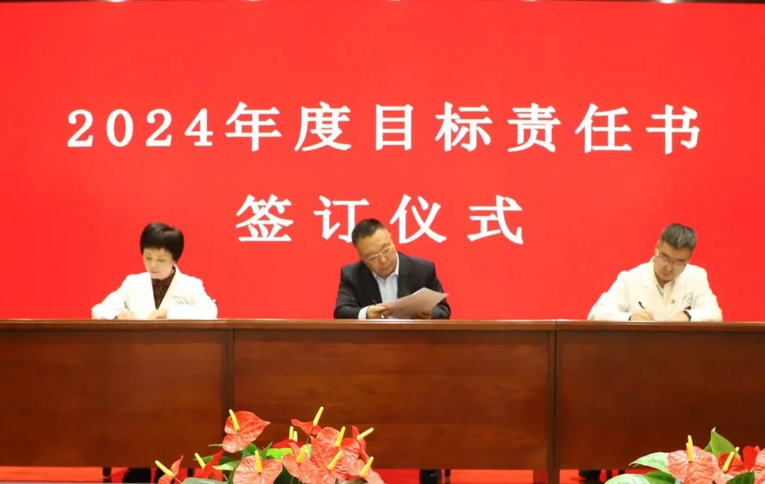 院长刘东海分别与主管副院长、临床医技等科室部门负责人签订2024年度目标管理责任书。