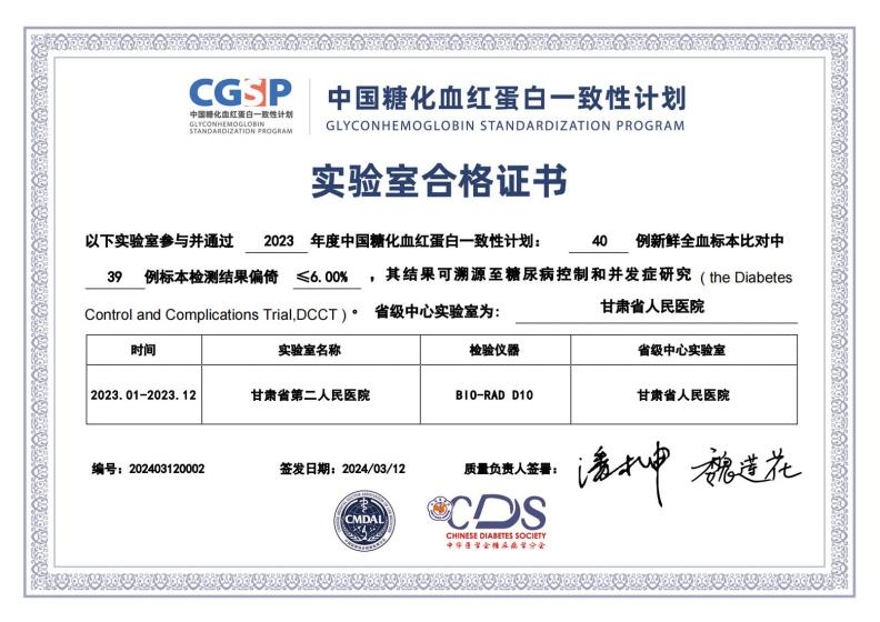 该证书的获得充分说明我院糖化血红蛋白检测结果可溯源至糖尿病控制和并发症研究(DCCT),可作为糖尿病的补充诊断标准,为进一步提高我院糖尿病诊疗水平提供有力保障。