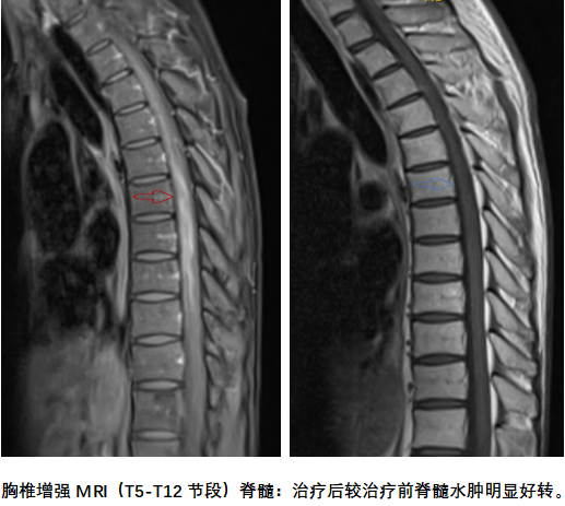 此时吴先生下半身已无知觉,移动全靠双上肢支撑,左眼无光感,胸段脊髓存在明确感觉平面。因其同时具备“脊髓炎”与“视神经炎”的典型表现,临床高度怀疑为视神经脊髓炎谱系疾病。