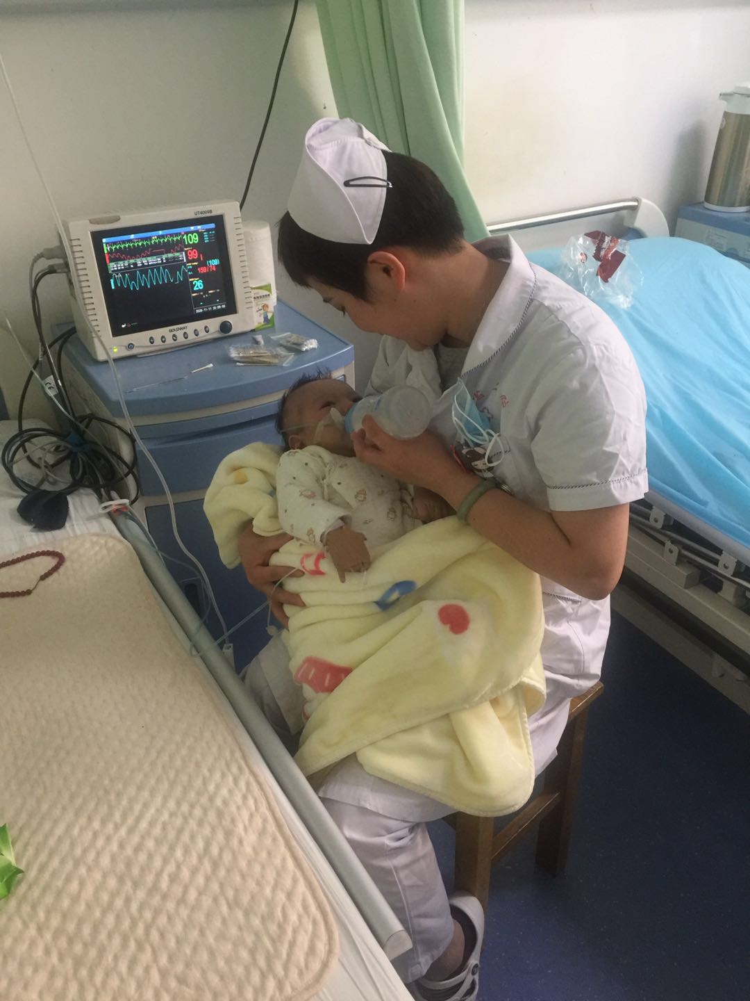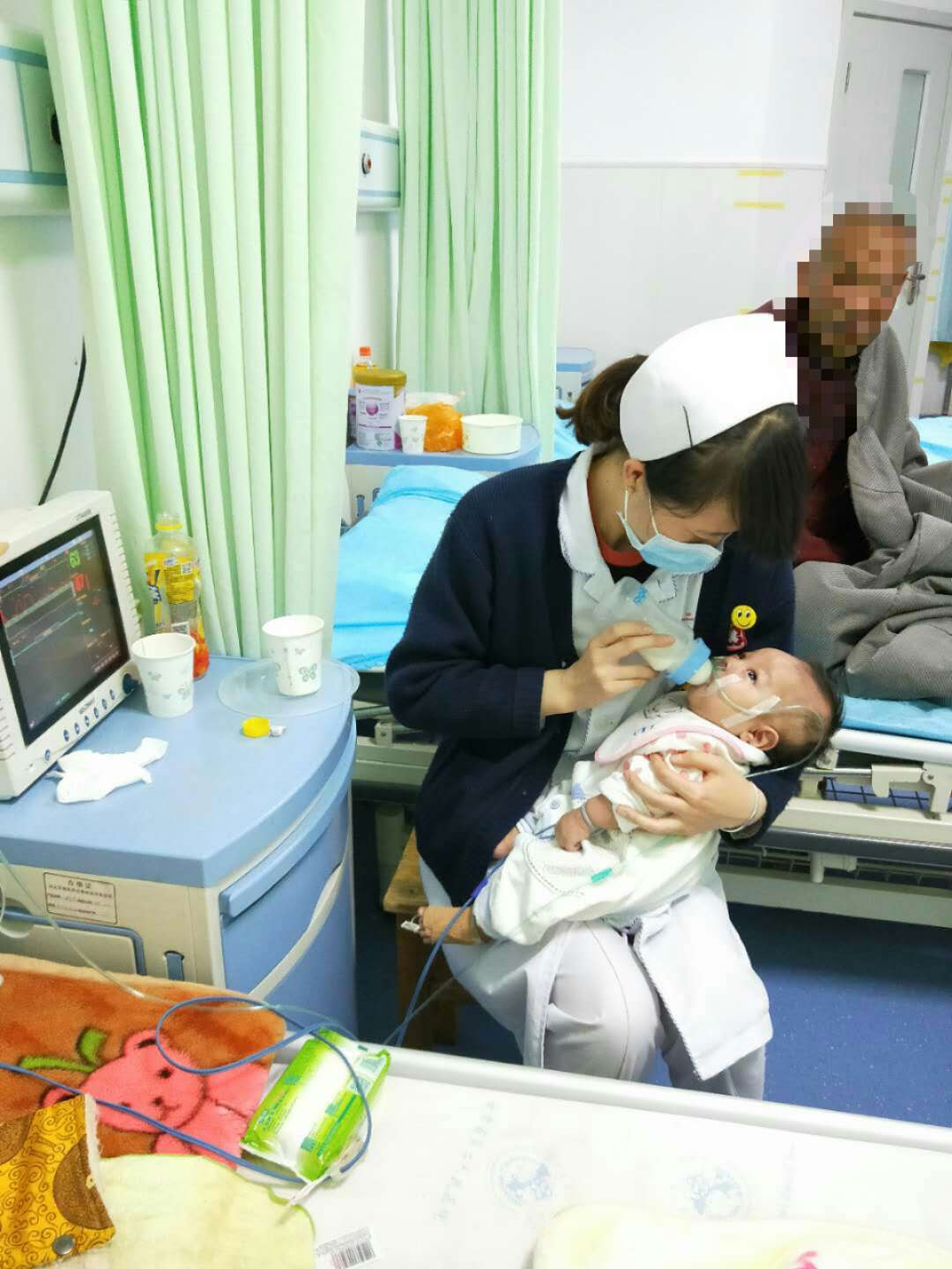 看着孩子白白的皮肤,清澈的眼眸,不断吮吸的小嘴,唤起了医护人员的母爱,滕主任听心肺时,总是先逗他玩一番,他开心了再检查,护士扎液体的时候总是想着轻一点再轻一点。孩子妈妈不会换尿布、不会冲奶粉,护士长和科里的护士们便当起了“兼职妈妈”,按时按点按照标准剂量给孩子冲奶粉,并抱在怀里喂孩子吃,哄他入睡,并用肢体语言一点一点给妈妈示范。因为走的急,孩子只裹了包单和一件薄薄的单衣,连裤子都没来得及穿,见状,黄瑛瑛护士长和护士们拿来了自家孩子穿过的衣服,还为小孩买了几件贴身的小衣物,给孩子换上。