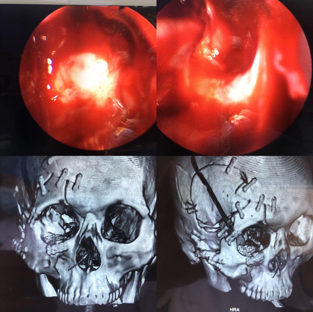 患者,达某,男,32岁,因"头面部伤伴意识不清4小时"以"右眼视神经管骨折"欲行"视神经管减压术"于2018年5月16日转入我院入住神经外科。入院时查,患者呈昏睡状,右侧头面部多处伤。右眼瞳孔约5mm,直接对光反射消失,间接对光反射差,左侧瞳孔约3mm,对光反射灵敏。双眼前后节未发现明显异常。CT显示蛛网膜下腔出血、硬膜下血肿、脑挫裂伤、颅骨多发骨折、右眼眶多发骨折、右侧神经管骨折。