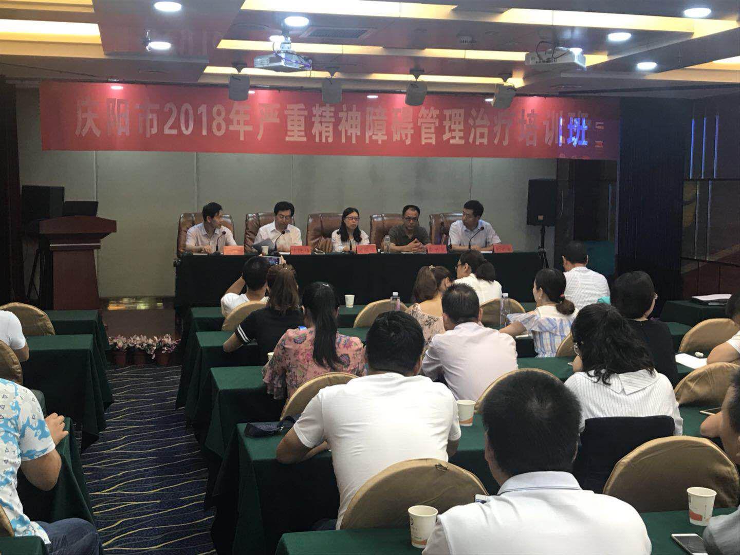 为深入推进全省精神卫生工作,积极践行全省健康扶贫的战略部署,8月3日,2018年庆阳市严重精神障碍管理治疗培训班在西峰区举行。本次培训会由甘肃省第二人民医院(甘肃省精神卫生防治中心)主办,庆阳市卫生计生委、庆阳市疾控中心积极协助,来自市级项目办负责人、相关科室负责人、各县区计生委项目办、疾控中心及医疗机构的分管领导和业务管理人员共计60人参加。会议由庆阳市疾控中心主任王文军主持,庆阳市卫计委副主任陆晓峰对省二院长期以来对庆阳市精神卫生工作的大力支持和帮助表示衷心的感谢,甘肃省第二人民医院(甘肃省精神卫生防治中心)副院长何蕊芳对庆阳市近年来在精神卫生工作取得的成绩、存在的问题及发展方向提出了积极的意见。