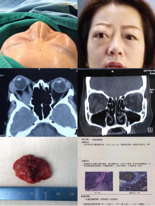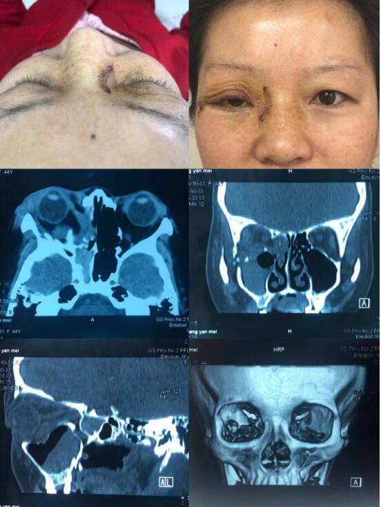 患者,女,44岁,因"右眼球突出3年,加重1年"以"右眼甲状腺功能障碍性突眼"于2018年10月22日入院。患者曾"激素"治疗无效。入院时查,双眼视力1.0,右侧眼压稍高,眼突度右眼22mm,左眼18mm,右眼向内、下活动受限,眼前后节未见明显异常。CT显示:右侧眼外肌肥大,泪腺肿大。全麻下行右侧内、外、下壁减压术,眶内脂肪减压及泪腺摘除术。泪腺病理报告:良性淋巴上皮病变。术后一周,视力双眼1.0,眼压正常,眼位正常,眼突度右眼19mm,左眼18mm,眼球上转稍受限,眼前后节正常。附术前术后照片。眼眶减压术是治疗甲状腺功能障碍性眼突等眼外肌肥大及眶内脂肪纤维化等原因导致眼突的最有效方法,手术的目的主要有两个:一个是增加骨性眼眶容量或(和)减少眶内容积从而使突出的眼球回位,二是眶减压从而解除肥大的眼外肌对视神经的压迫由此改善压迫性视神经病变。