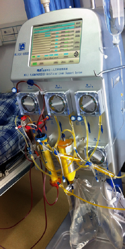 双重血浆分子吸附(DPMAS)联合血浆置换(PE)是一种新的组合治疗模式,采用交换树脂(BS330)和中性大孔树脂(HA330-II)两种吸附剂联合应用,两种吸附剂的组合应用迅速改善黄疸症状的同时清除炎性介等有物质,从而达到标本兼治的效果。
