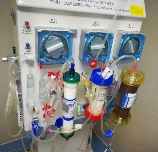 非生物型人工肝系统是一台体外仪器。借助这台仪器把患者的血液引流出来,在体外进行血浆置换、血浆吸附、血液滤过等步骤,清除血液中的黄疸毒素等有害物质,补充蛋白质和凝血因子,通过暂时替代肝脏的解毒、蛋白质合成和部分代谢功能,使肝细胞得到再生的机会,肝功能得以恢复。