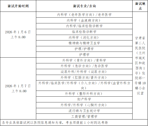 1.报考护理学专业(要求第一学历为全日制本科,且年龄在30周岁及以下)初审通过的考生,资格复审时间:2025年12月24日-12月25日上午8:00-12:00,下午14:30-17:30。资格复审通过的考生于2025年12月29日参加理论+技能测试,按照1:5比例进入院级面试环节。