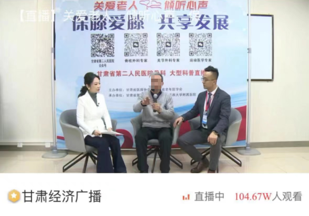 12月24日,在第四届甘肃省骨科论坛暨甘肃省保膝高峰论坛举办之际,省二院成功开通了“关爱老人 倾听心声 保膝爱膝 共享发展”大型科普直播活动,本次科普活动邀请国内多位顶级大咖就老年人常见疾病展开线上科普,共计在线人数达100➕万,取得了广泛的影响!