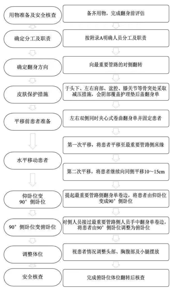人员分工及职责:1号位(头部)由高年资护士担任负责固定人工气道导管、发号施令及指挥;2号位(右上)负责预留足够长度的输液管,确保翻身过程中的用药安全;3号位(左上)负责预留足够长度的监护仪导线、呼吸机管路的安全、生命体征的观察;4号位(右下)、5号位(左下)负责固定同侧引流管,避免受压。沿患者身体纵轴线方向放置引流管,将引流瓶及引流袋置于身体外侧,将尿管置于患者两腿中间。