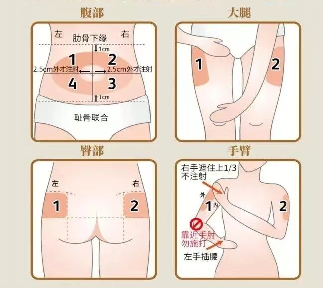 1.注意注射部位的轮换:可以将注射部位分成2个或4个等分区域,每周使用同一个区域,并按顺时针方向轮换。