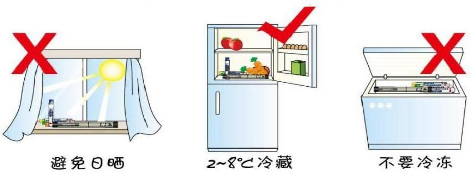 5.未开封使用的胰岛素应于2-8℃冰箱冷藏,切勿冷冻;已开封胰岛素可于室温下(不超过30℃)保存4周。